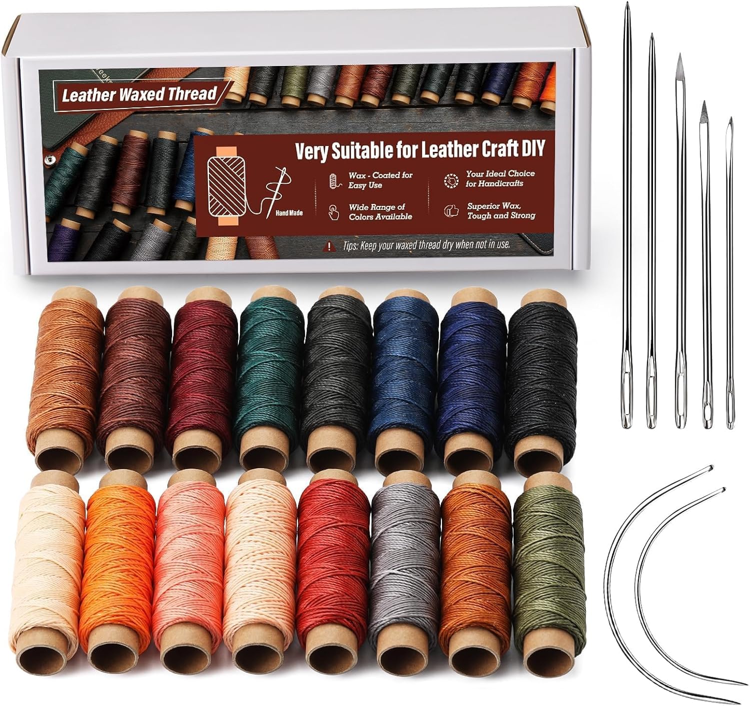 - Round Waxed Thread: Wax thread uses 3 strands of thread, make the thread stronger, waxed thread is not easy to unravel, preventing the stitches from coming loose and ensuring the longevity of the work, wax thread is evenly waxed, which can reduce friction during needle threading and sewing, and improve the smoothness of operation